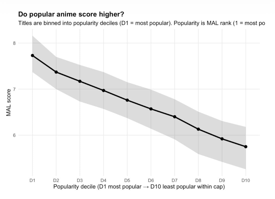 Popularity on MyAnimeList is, in effect, an attention register—a rank that largely tracks how many people have added a title to their lists (membership), not whether it is “objectively” great. (Kaggle) Your decile chart turns that attention register into a clean map: within the top 12,000 popularity ranks, the median score slides from 7.73 in D1 (most popular) to 5.75 in D10 (least popular)—almost a two-point drop. The “elite” zone becomes rare with startling speed: 34.4% of D1 titles score 8+, but that falls to 12.4% in D2, 5.5% in D3, and is effectively near-zero through much of the bottom half of the distribution. In museum terms, the front gallery does not contain all the masterpieces—but it contains a far higher concentration of them, while the back rooms swell with competent craft, unfinished experiments, forgotten commissions, and work that never acquired an audience large enough to stabilize its reputation.