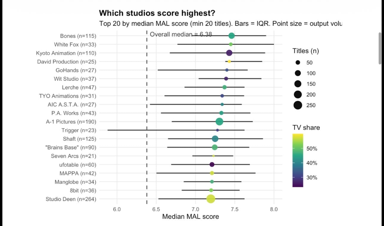 Finally, your color layer (% TV) gives a quiet but important industrial read: some studiosʼ reputations are being built mostly through TV pipelines (higher TV share), while others accumulate credits through a mix of TV, films, and specials. Kyoto Animationʼs TV share is relatively low in your top list, which matches the fact that their catalog includes major films and specials alongside series (and the studio is structurally known for careful output planning). (Kyoto Animation) Meanwhile large generalist studios like A-1 Pictures and Studio Deen appear with huge output volumes (big dots) but slightly lower medians—exactly what youʼd expect from “industrial scale studios” that span many eras and genres, from mainstream hits to forgettable contract work. (Wikipedia) The headline insight: the studios that “win” here arenʼt necessarily the ones with the single biggest hit—theyʼre the ones whose typical show stays above the platformʼs baseline despite real volume.
