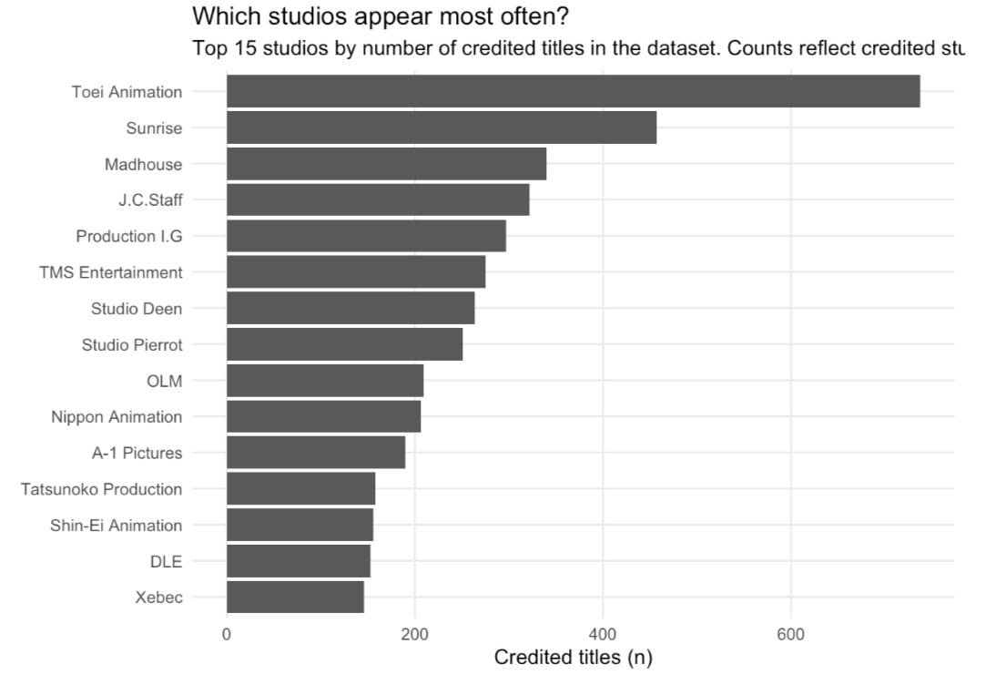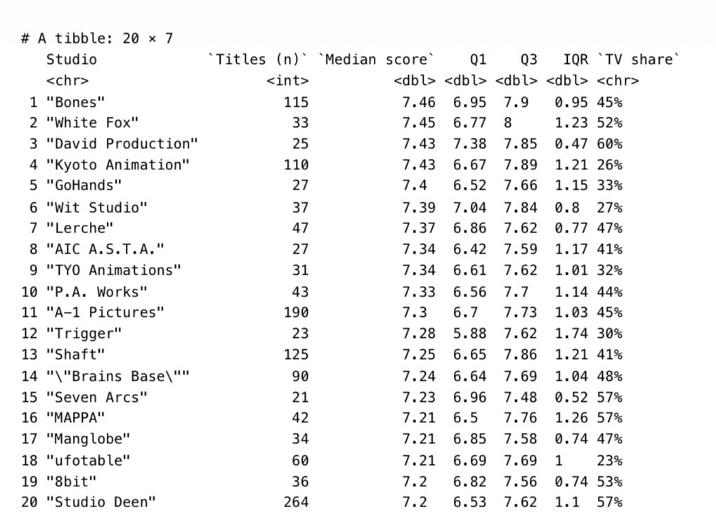 A second pattern is the presence of “prestige reputation studios” whose brand is closely associated with specific hit franchises or stylistic signatures. White Fox (noted for Steins;Gate and Re:Zero) shows up with a very high median but a smaller catalog—high typical score, but fewer observations compared to the industrial giants. (Wikipedia) David Production is similar: strong median with a tighter IQR, and itʼs closely tied to well-known properties like JoJoʼs Bizarre Adventure and Fire Force. (Wikipedia) In your interpretation, these are “high quality signals,” but you should also frame them as more sensitive to title selection (a few big projects can pull their median more than they would for a 200+ title studio).