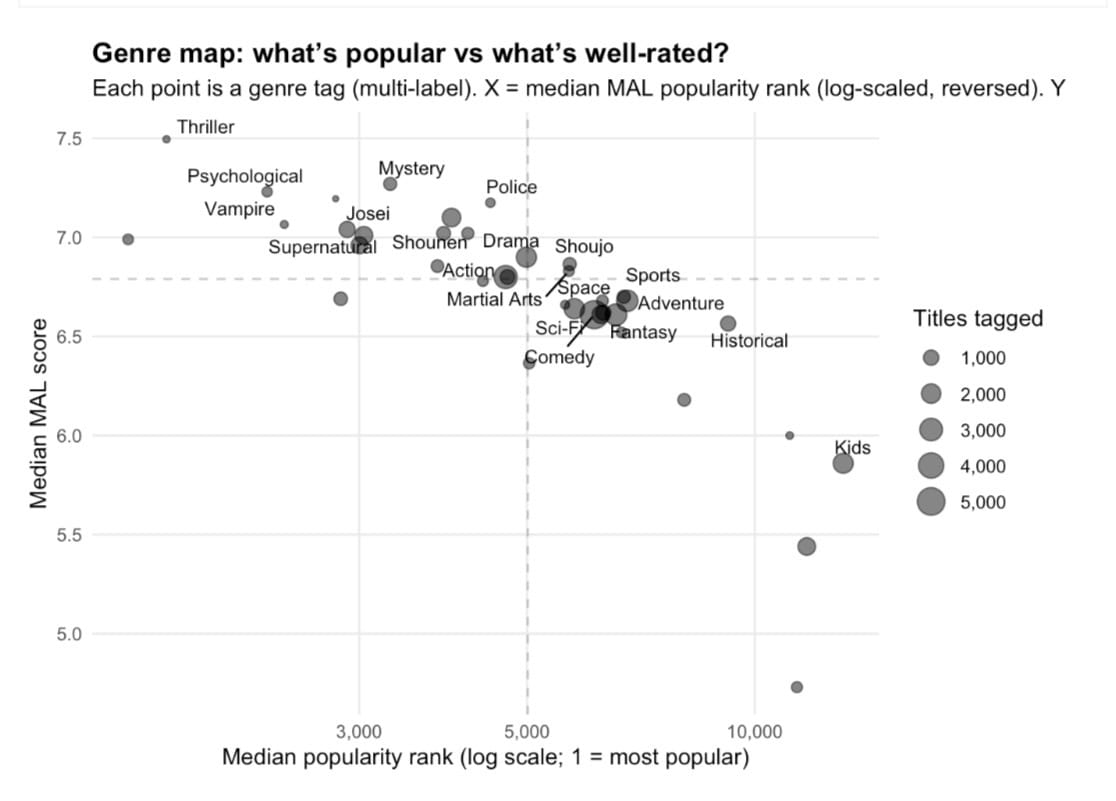 In this chart, each point is a genre tag (multi-label, so a single title can contribute to several bubbles). The x-axis is median MyAnimeList popularity rank (lower = more popular), while the y-axis is median MAL score—a rough proxy for attention versus reputation. In an “information-rich” environment, this distinction matters: as Herbert Simon argued, abundance of information creates a scarcity of attention, and the binding constraint becomes what people notice, not what exists. (People at Berkeley iSchool) The result is a cultural market where some genres dominate the atrium (high throughput, broad appeal), while others occupy quieter wings—sometimes still well reviewed, but harder to discover.