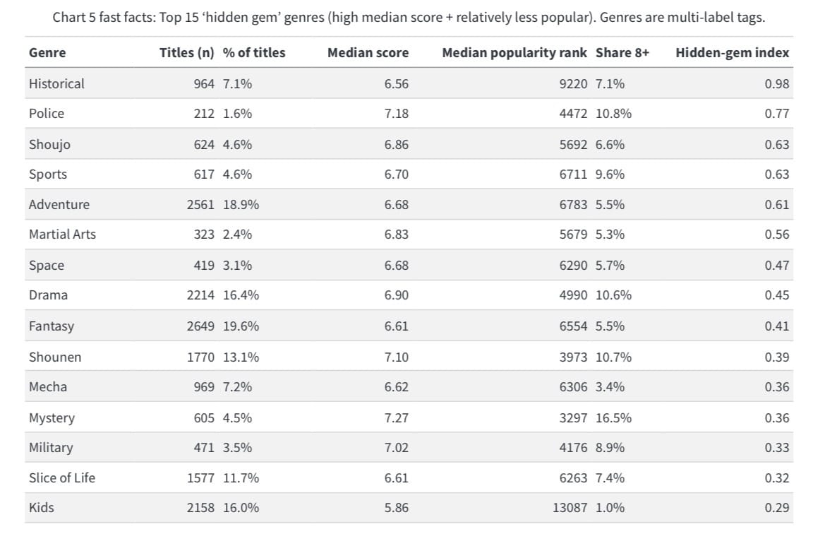 The chart also hints at how platform-mediated reputation differs from “objective quality.” MALʼs metrics are produced by a self-selected crowd, and the dataset itself comes from MyAnimeList via the TidyTuesday release, with titles lacking rankings or popularity excluded—so what you are observing is a structured slice of the platformʼs measurable universe. (GitHub) This is why genres like Kids can appear structurally disadvantaged: despite being large (2,158 titles; 16.0% of titles), it shows a lower median score (5.86) and a very small 8+ share (1.0%), consistent with the idea that rating cultures often reward complexity, novelty, and “prestige cues” more than simplicity or child-targeted design. In short, Chart 5 reads like a cultural-economics map of anime consumption: attention is scarce, reputation is unevenly distributed, and discovery mechanisms may systematically widen the gap between “what is well liked” and “what is widely seen.”