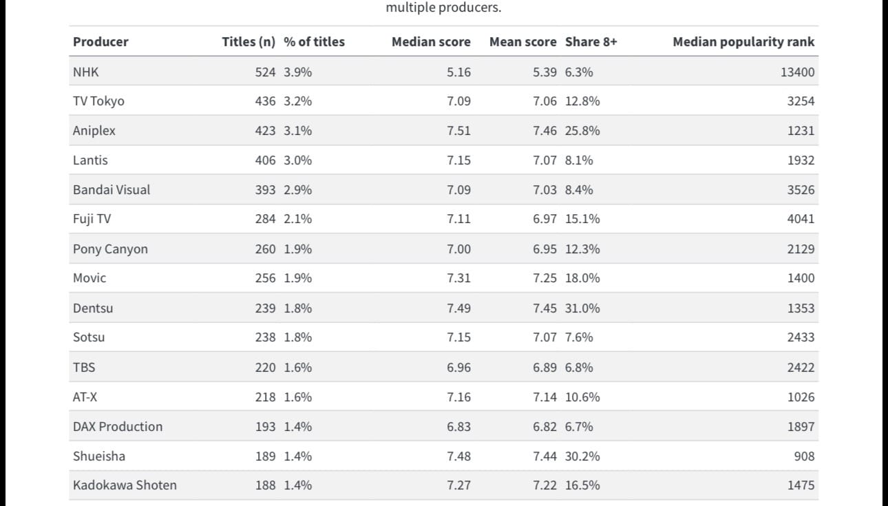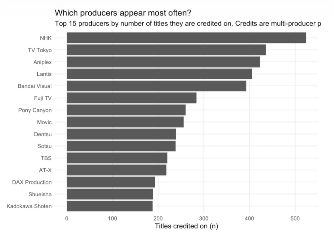 Put differently, Chart 7 reads like a museum placard for the hidden architecture of modern fandom: broadcasters (NHK, TV Tokyo, Fuji TV, TBS, AT-X) provide distribution chokepoints; publishers (Shueisha, Kadokawa) supply pre-validated narratives and characters; labels and entertainment arms (Aniplex, Lantis, Pony Canyon, Movic) industrialize music/merch; and ad/marketing firms (Dentsu) specialize in scaling attention. The tableʼs strongest signal is not “who makes the best anime,” but who owns the levers that turn stories into repeatable, exportable assets—and why the same names recur across thousands of titles in a market that appears, on the surface, infinitely varied. (Crunchyroll)